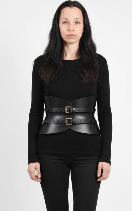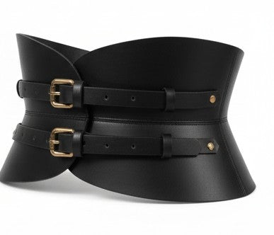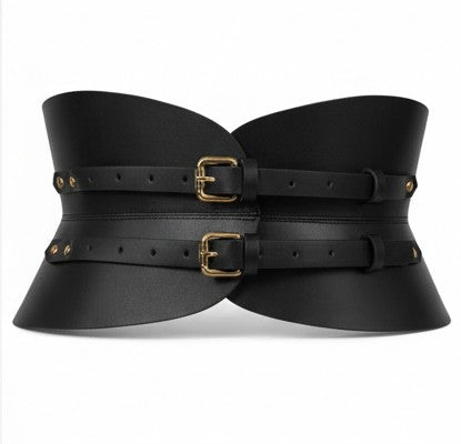 Cinturón ancho estilo corsé confeccionado en piel natural negra, diseñado para envolver el cuerpo con presencia, fuerza y elegancia. Su cierre de dos hebillas pequeñas en acabado oro viejo aporta un carácter atemporal y artesanal, evocando equilibrio entre lo ancestral y lo contemporáneo.